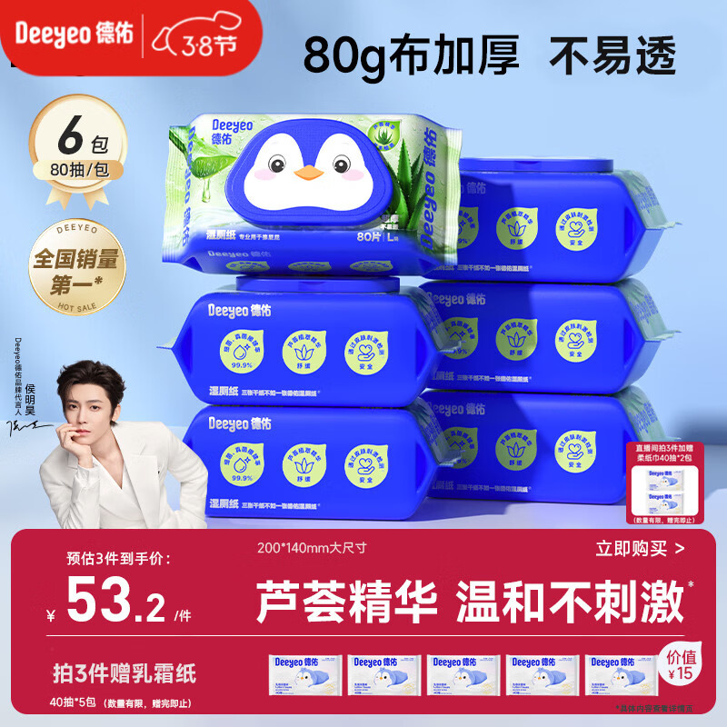 德佑芦荟湿厕纸洁厕湿纸巾80抽*6包私处清洁擦屁屁无刺激加厚温和亲肤