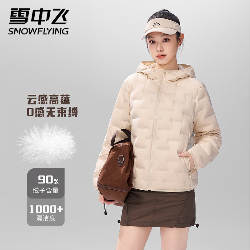 雪中飞连帽羽绒服女90绒0感轻薄高蓬松纯色冬季保暖羽绒外套 浅米M