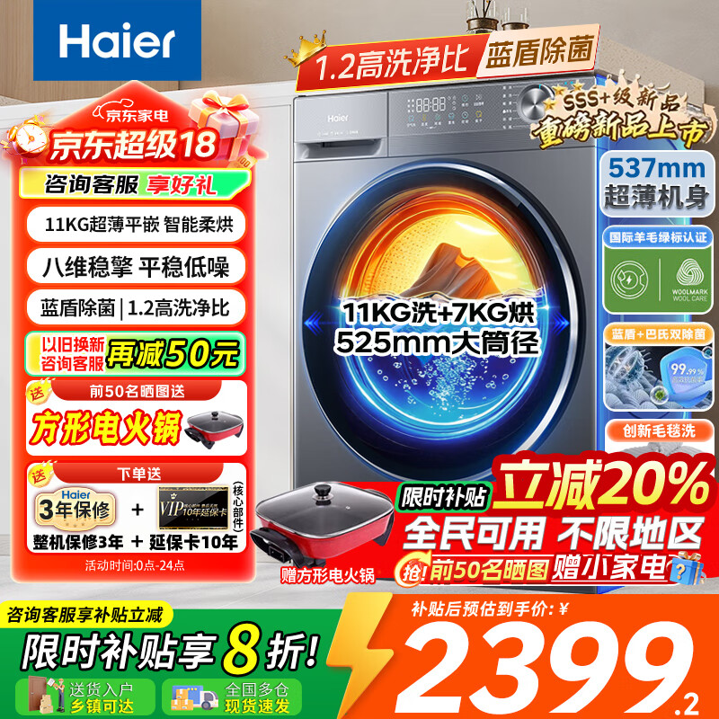 海尔(Haier)超越4.0滚筒洗衣机11公斤大容量全自动超薄平嵌525大筒径八维减震蓝盾除菌58E1 以旧换新 补贴20% 11公斤洗烘+1.2高洗净比+智能柔烘+537超薄