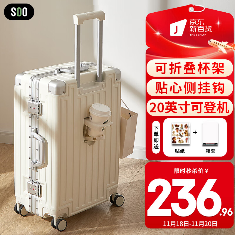 SOO铝框行李箱高颜值拉杆箱小型旅行箱密码箱登机箱带杯架白色20英寸