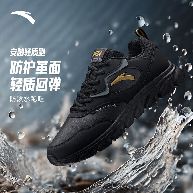 安踏男鞋革面防泼水跑步鞋男黑色轻便防滑休闲鞋运动鞋旅游鞋子男