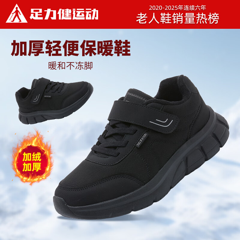 足力健防滑老人鞋加厚保暖棉鞋冬季防寒雪地靴加绒爸爸鞋9160 黑色 42