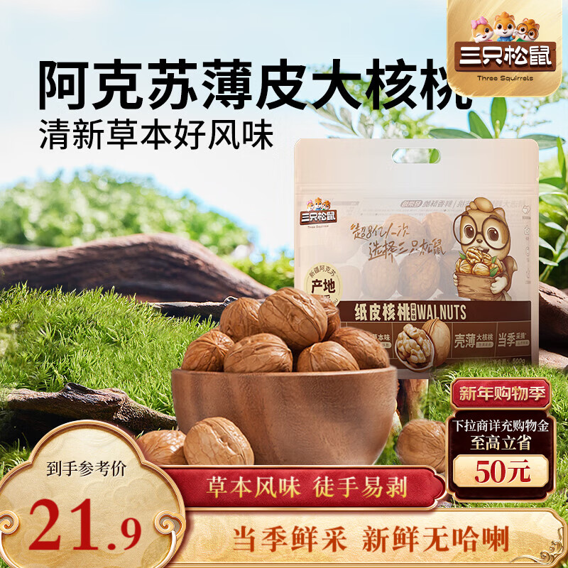 三只松鼠量贩袋装草本味纸皮核桃500g 每日坚果炒货休闲零食品