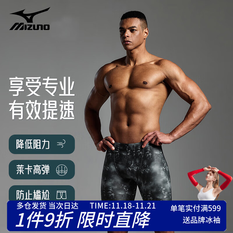 美津浓(MIZUNO)游泳裤男士泳镜套装专业速干防尴尬抗氯五分裤大码长裤BC112黑2XL