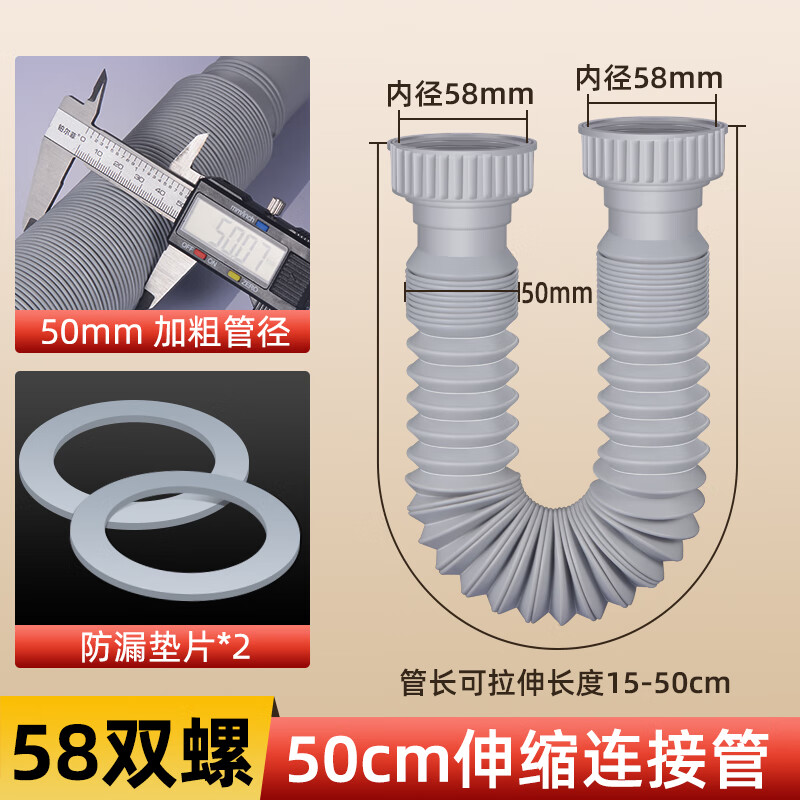 一靓 厨房双菜盆双螺纹联接管螺口软管双槽洗菜盆排水管下水管加长 【伸缩款-58mm双螺纹连接管