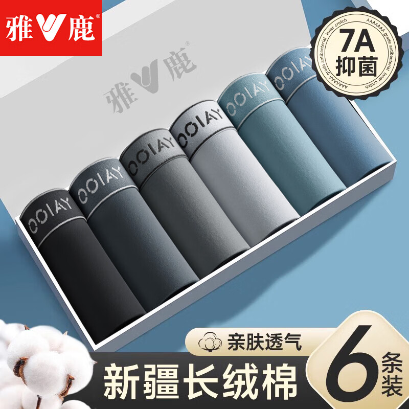 雅鹿6条装男士内裤男纯棉无痕抑菌内档舒适运动宽松透气大码平角短裤 纯棉抗菌 6条 2XL 【建议120-150斤】