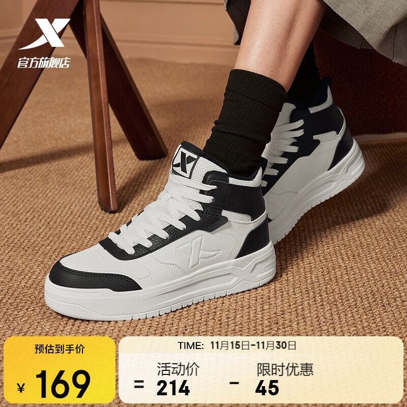 特步女鞋运动板鞋加棉冬季保暖增高2025新款板鞋小白鞋棉鞋 黑/帆白