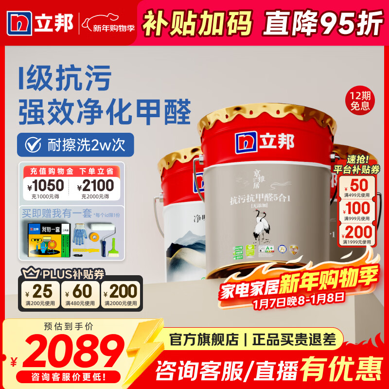 立邦瓷净墙面乳胶漆荷净抗污抗甲醛全效油漆内墙漆室内家用涂料 【抗污五合一】54L 套装(2面1底) 免费调色