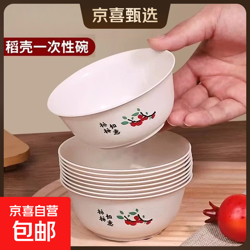 稻壳一次性碗筷餐具圆碗可降解环保食品级加厚酒席加硬耐高温家用 加厚柿柿如意 加厚350ML【80个】