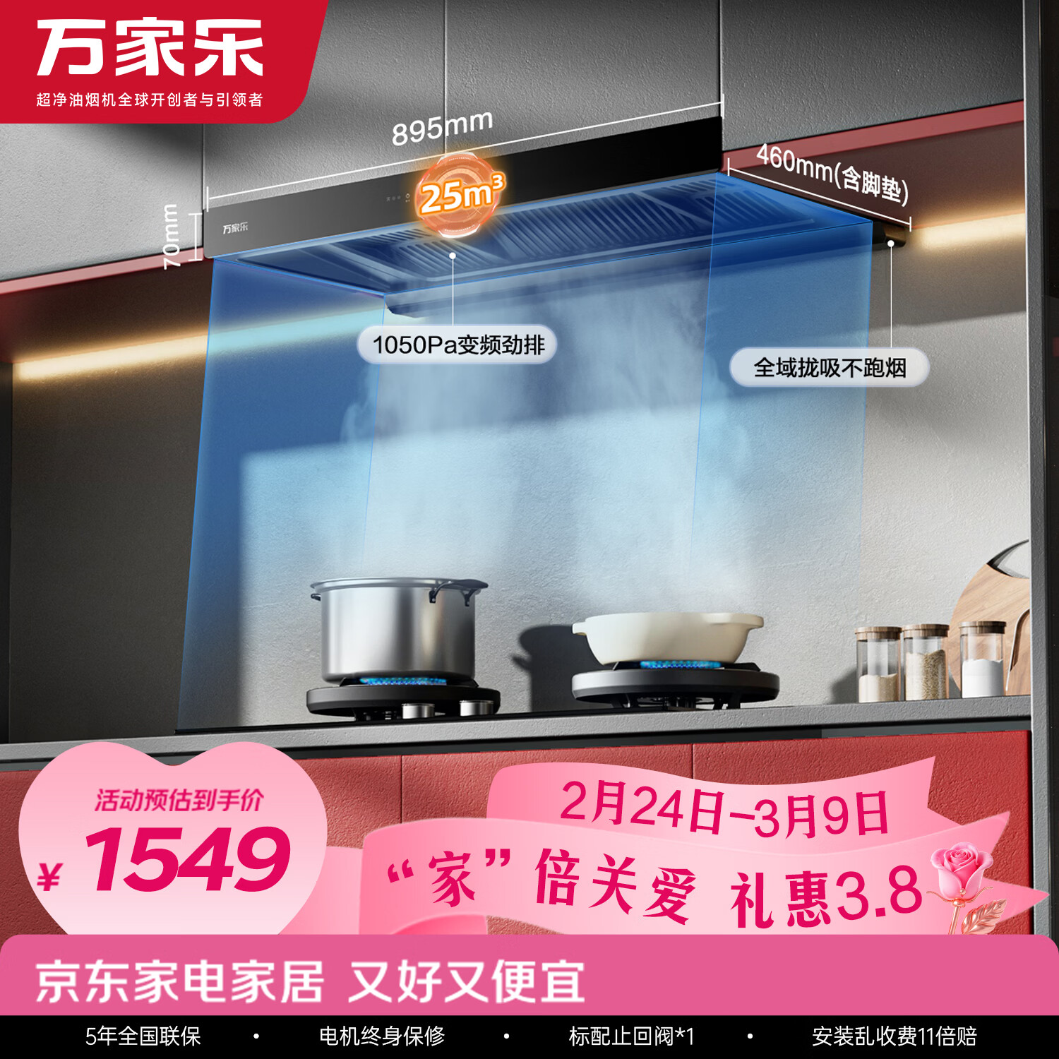 万家乐抽油烟机【小飓风T5】 25m³/min变频大吸力欧式跨界超薄平嵌智能烟灶联动免拆洗油烟机CXW-230-T5
