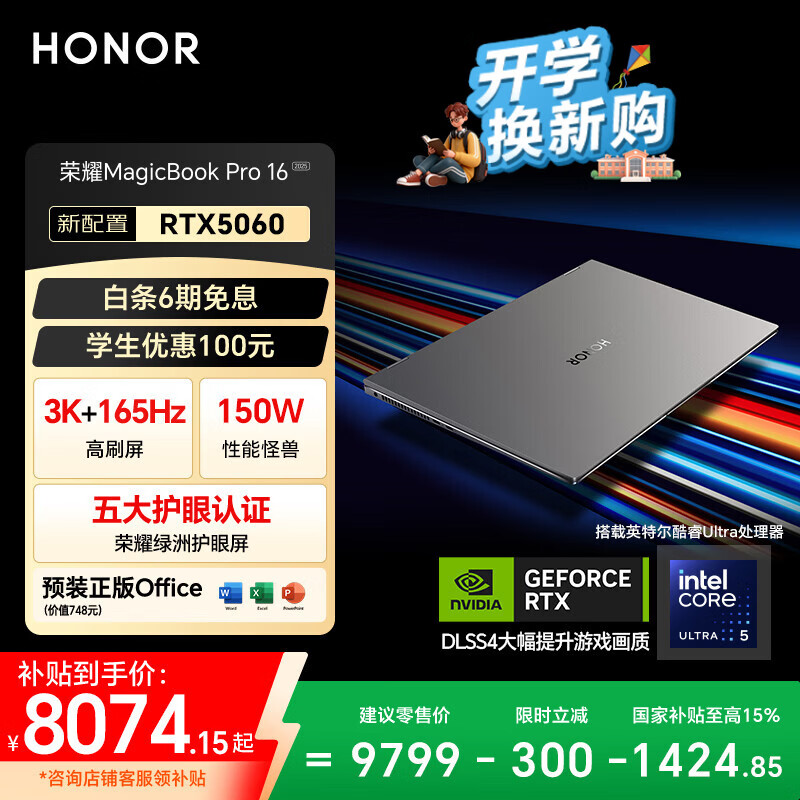 荣耀MagicBook Pro16 2025 Hunter【国家补贴】3K电竞屏 AI轻薄游戏本 RTX5060 U5-225H 32G 1T 星辰灰