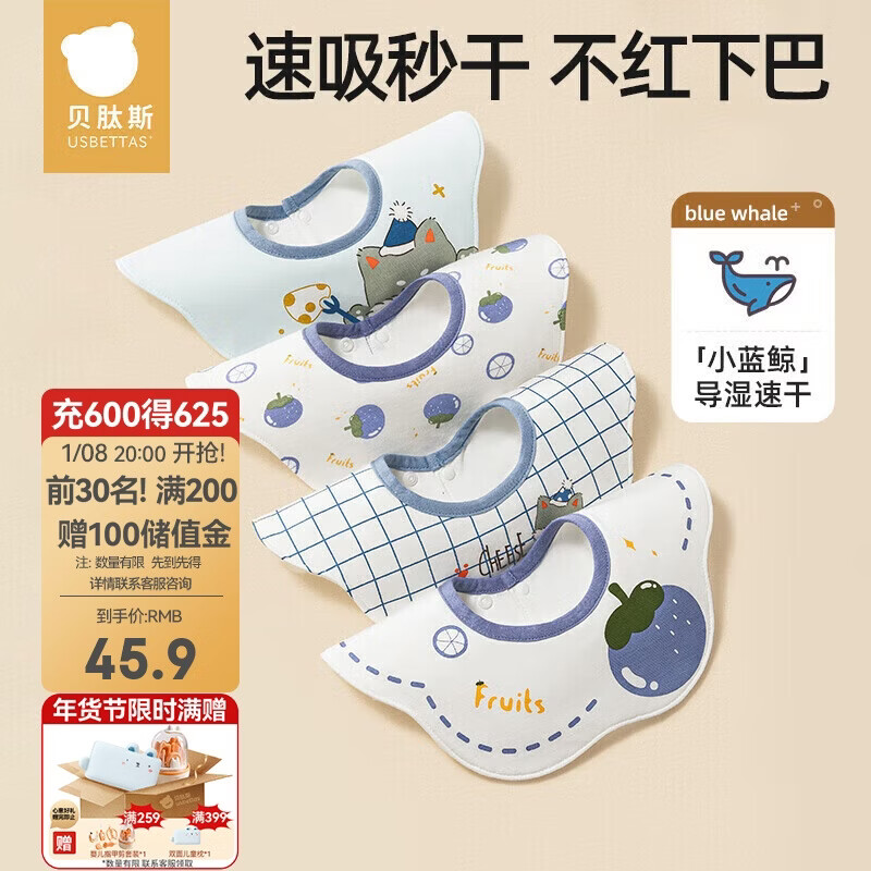 贝肽斯婴儿口水巾宝宝围嘴导湿速干四季薄款新生儿防水围兜 蓝果4条装