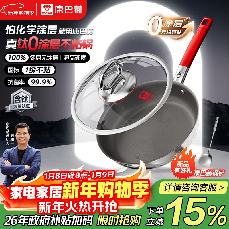 康巴赫真钛0涂层抗菌316L不锈钢平底锅煎锅28cm少油烟不粘锅电磁炉通用