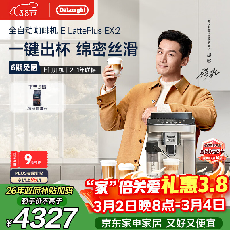 德龙(Delonghi)咖啡机 家用全自动咖啡机进口 意式现磨自动奶泡卡布奇诺迷你奶缸全彩触屏 E LattePlus EX:2 礼物