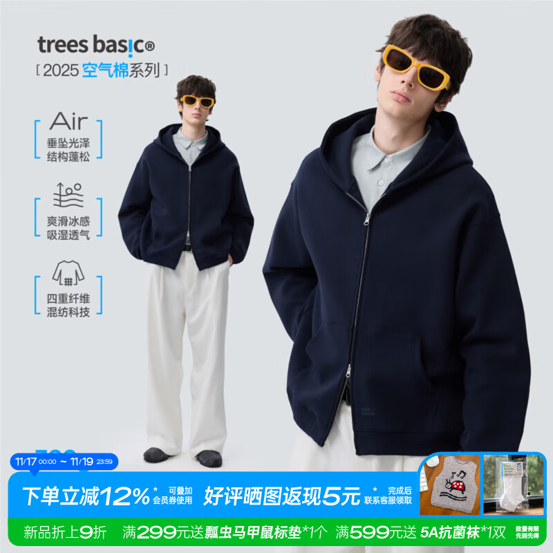 warmtrees连帽开衫卫衣男秋冬季宽松休闲空气棉外套长袖情侣上衣运动服装 藏青色 2XL