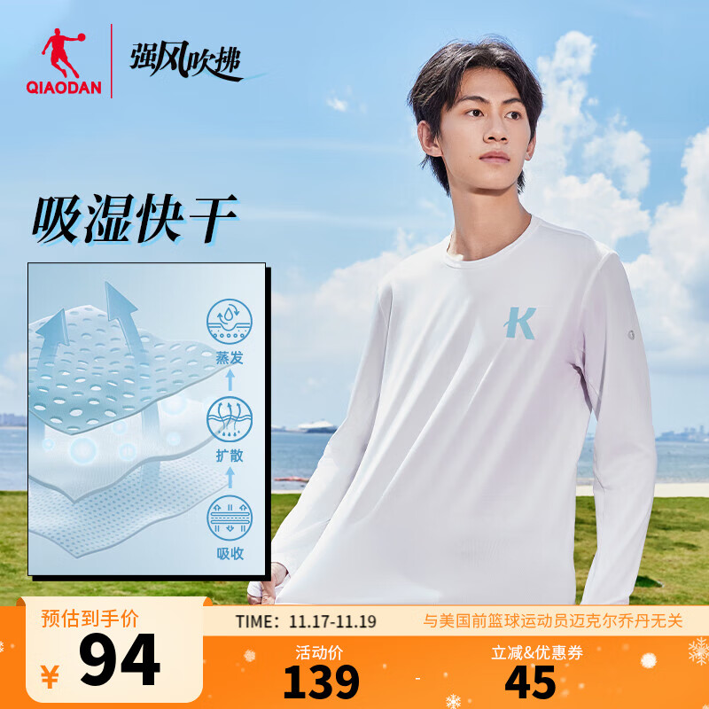 乔丹QIAODAN强风长袖t恤男外套秋冬季透气速干运动跑步马拉松上衣 乔丹白 M