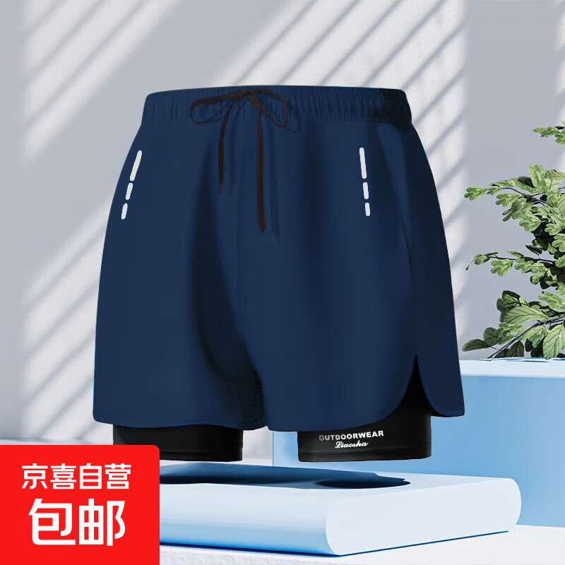 跨境爆款泳裤运动双层男士跑步运动健身防尴尬宽松沙滩裤游泳套装 藏青色 M 【建议70-90斤】
