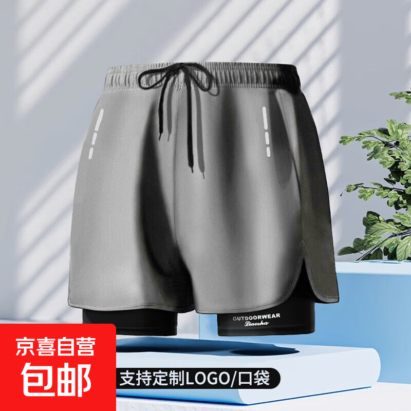 跨境爆款泳裤运动双层男士跑步运动健身防尴尬宽松沙滩裤游泳套装 浅灰色 L 【建议90-110斤】