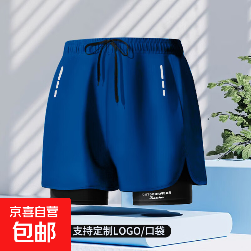 跨境爆款泳裤运动双层男士跑步运动健身防尴尬宽松沙滩裤游泳套装 蓝色 L 【建议90-110斤】