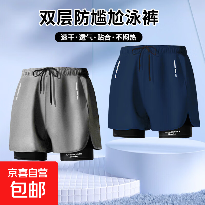 跨境爆款泳裤运动双层男士跑步运动健身防尴尬宽松沙滩裤游泳套装 【灰色+藏青】两件套 3XL 【建议150-170斤】