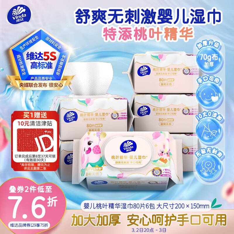 维达(Vinda)婴儿手口湿巾80片*6包 桃叶精华加厚加大手口专用亲肤湿纸巾大包