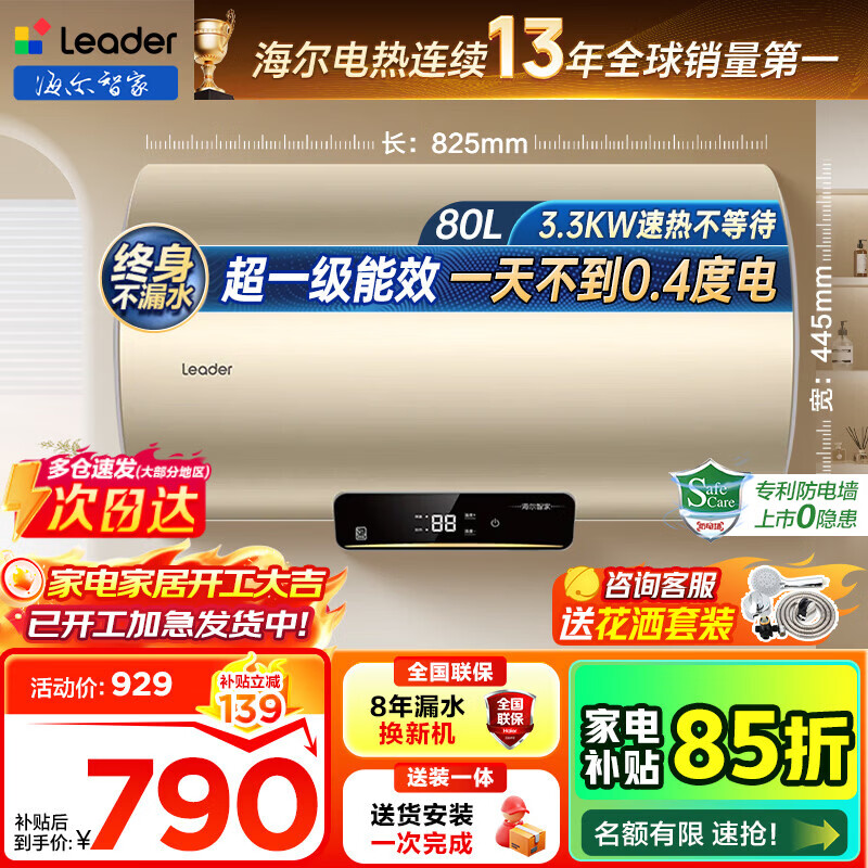 海尔(Haier)【咨询客服领补贴】热水器电热水器家用储水式变频速热一级能效节能省电金刚无缝胆海尔智家Leader 80L 3300W 超一级能效/镁棒免换DN1