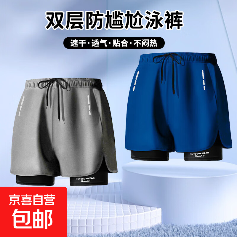 跨境爆款泳裤运动双层男士跑步运动健身防尴尬宽松沙滩裤游泳套装 【灰色+蓝色】两件套 XL 【建议110-130斤】