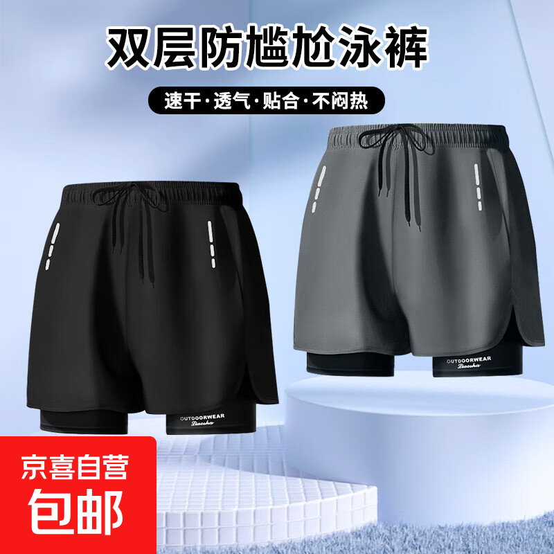跨境爆款泳裤运动双层男士跑步运动健身防尴尬宽松沙滩裤游泳套装 【黑色+灰色】两件套 4XL 【建议170-190斤】
