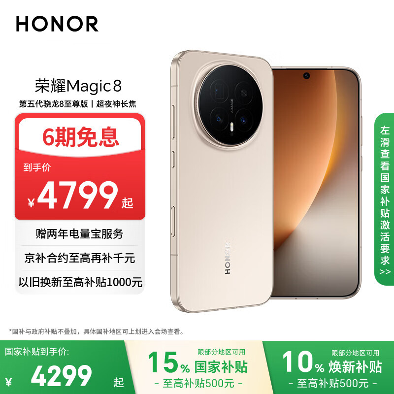 荣耀Magic8 12+512 旭日金 第五代骁龙8至尊版 超夜神长焦 新一代青海湖电池 5G AI手机 国家补贴