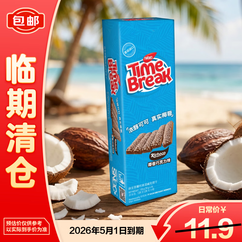纳宝帝印尼进口臻时椰香巧克力味涂层威化饼干120g【临期清仓】
