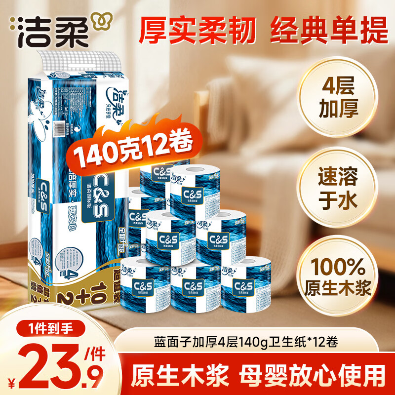 洁柔有芯卷纸 蓝面子4层140g*12卷 加厚家用卫生纸卷纸厕纸