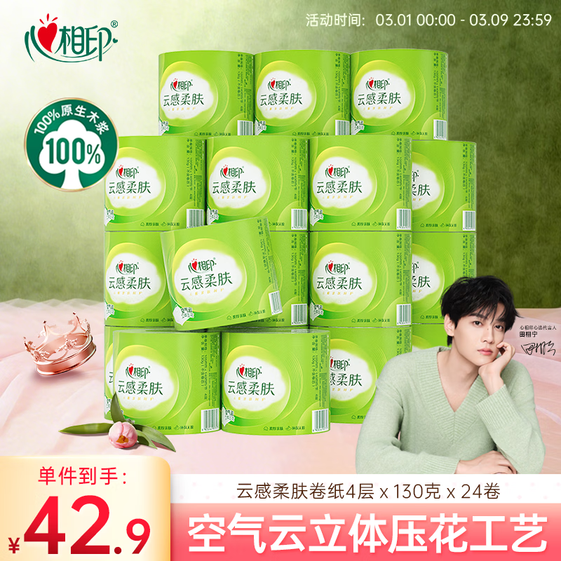 心相印【田栩宁推荐】有芯卷纸云感柔肤4层130克*24卷 加厚卷筒纸