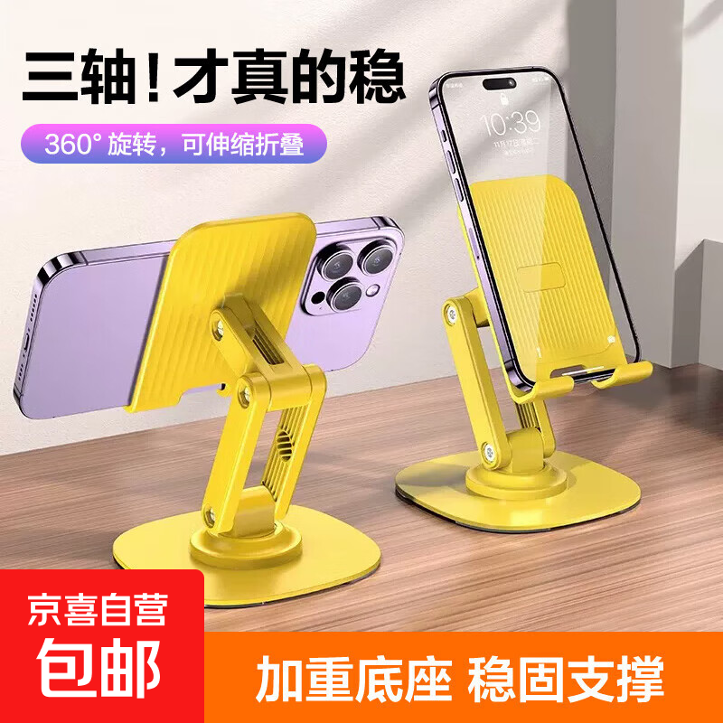 碳钢金属底座手机支架IPAD平板支架懒人桌面直播拍视频旋转高度可调节升降小巧便携支撑架可折叠 AR三轴旋转桌面支架-黄色