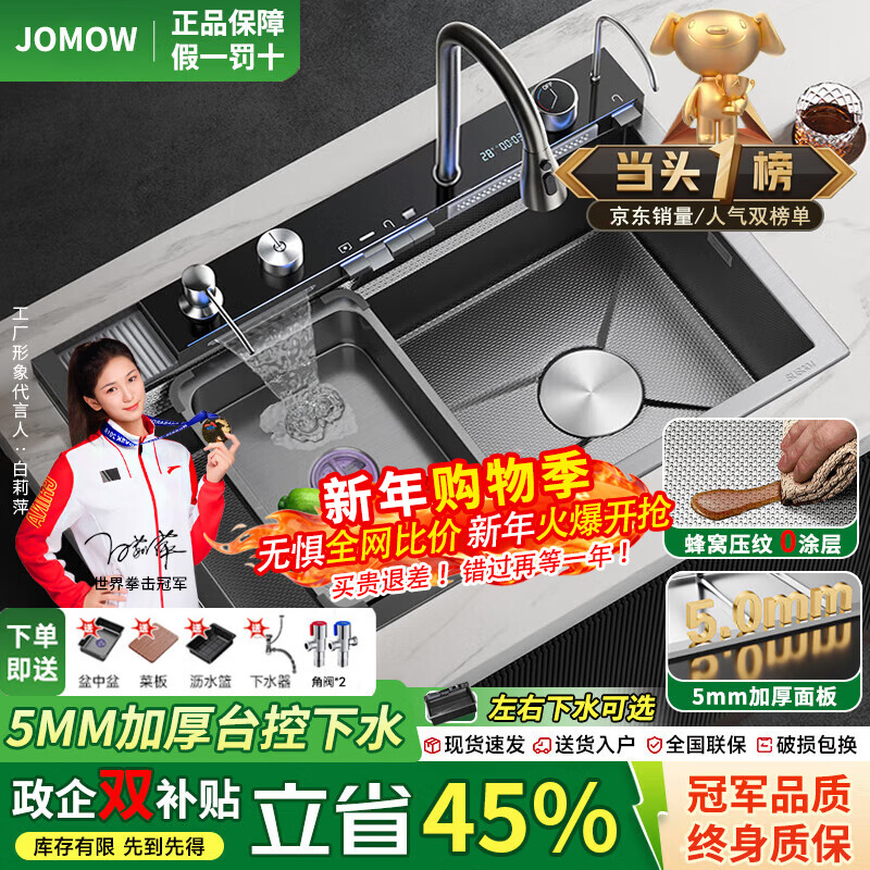 JOMOW鲸鱼瀑布飞雨厨房水槽大单槽数显304不锈钢蜂窝洗菜一体盆 75*45【顶配升级】鲸鱼双瀑布出水