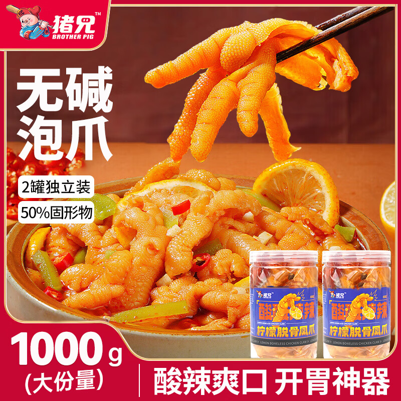 猪兄柠檬酸辣脱骨无骨鸡爪 1000g年货必备下酒菜佤味解馋休闲小零食品