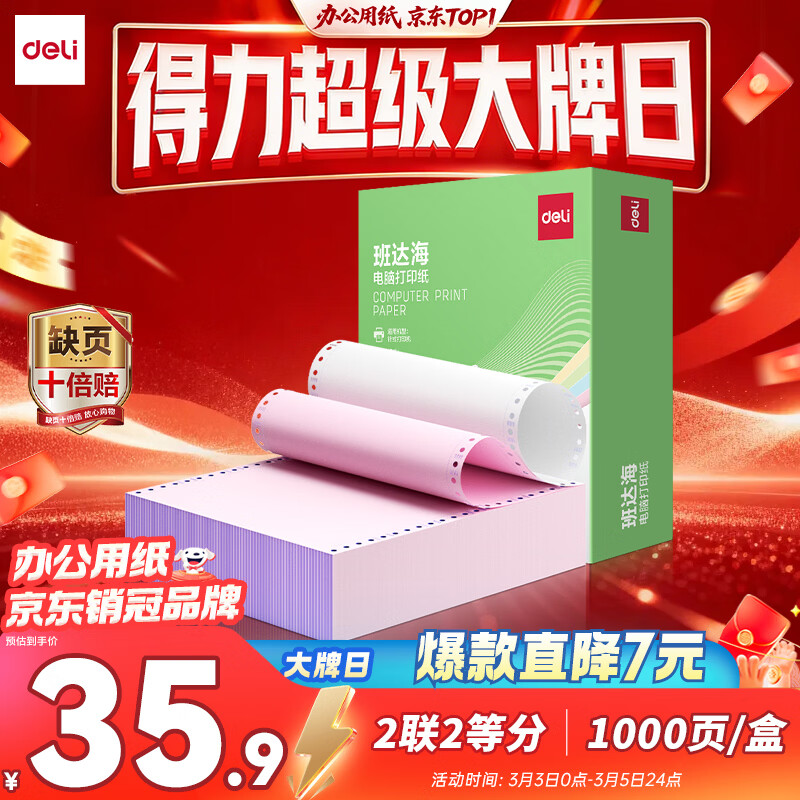 得力(deli)【缺页十倍赔】班达海二联二等分针式打印纸 可撕边 彩色(白红)发票报销单1000页/箱BD241-2-1/2CS