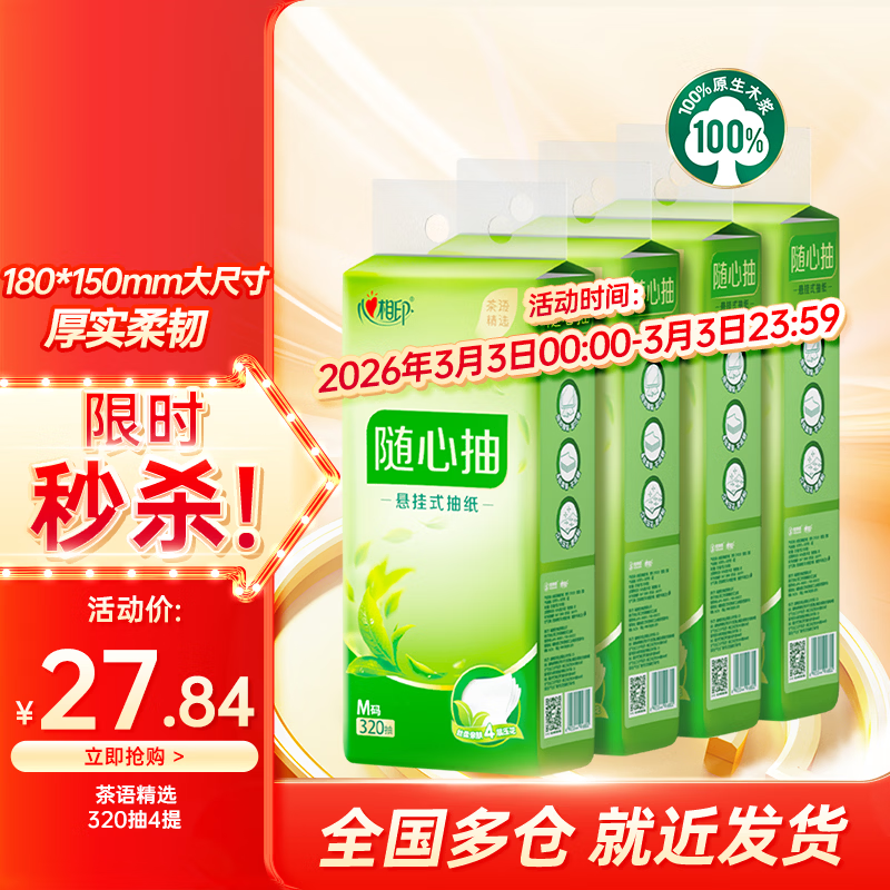 心相印抽纸悬挂式抽纸大包M码加厚320抽4层面巾纸家用厕纸纸巾 4层320抽*4提【茶语精选】