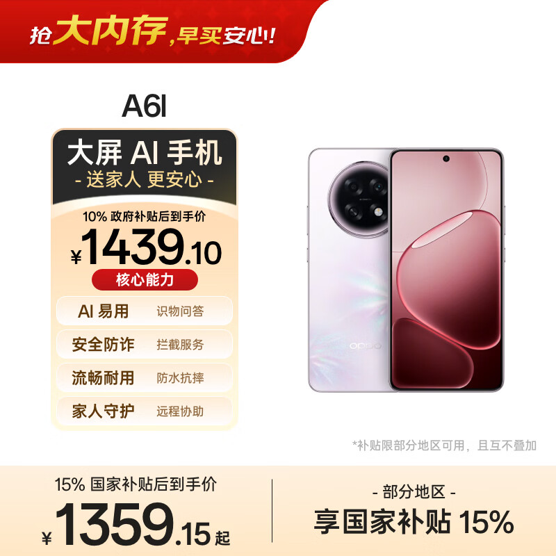 OPPO A6l 12GB+256GB 海棠粉 第三代高通骁龙7 IP69防水 7000mAh长续航 5G 老年人大屏手机 国家补贴