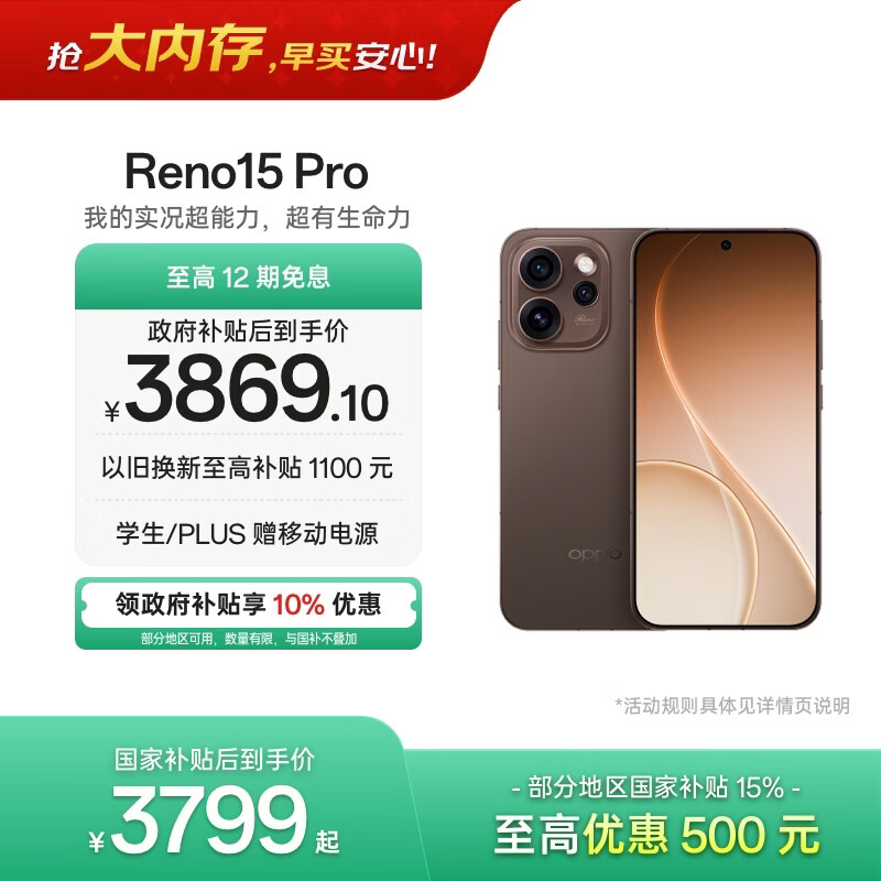 OPPO Reno15 Pro 16GB+512GB 可露丽棕 2亿像素 无线充电 AI实况 直播拍照 5G智能手机 新品 国家补贴