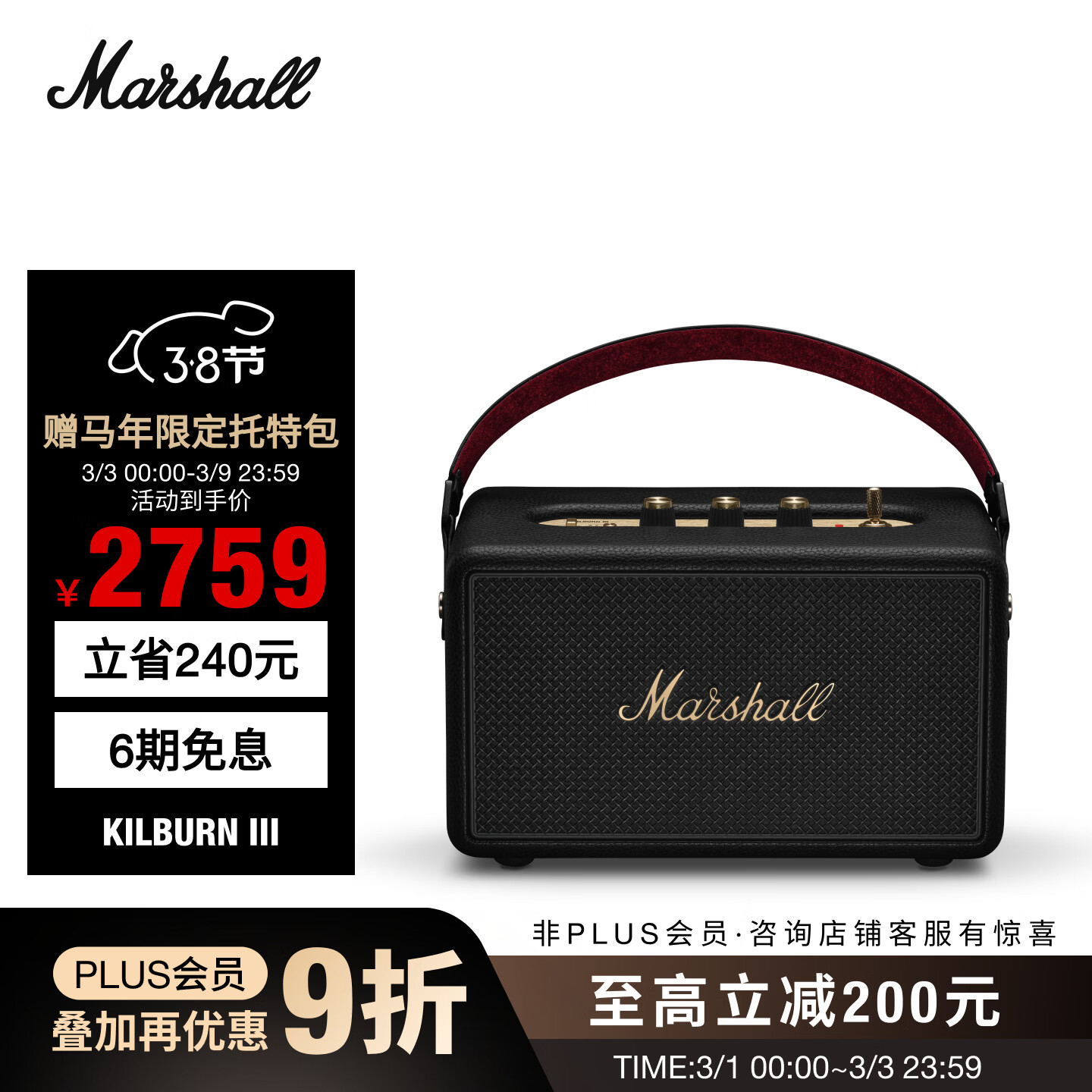 Marshall(马歇尔)Kilburn III音箱无线蓝牙便携式3代家用户外防水重低音节日礼物音箱 黑金色