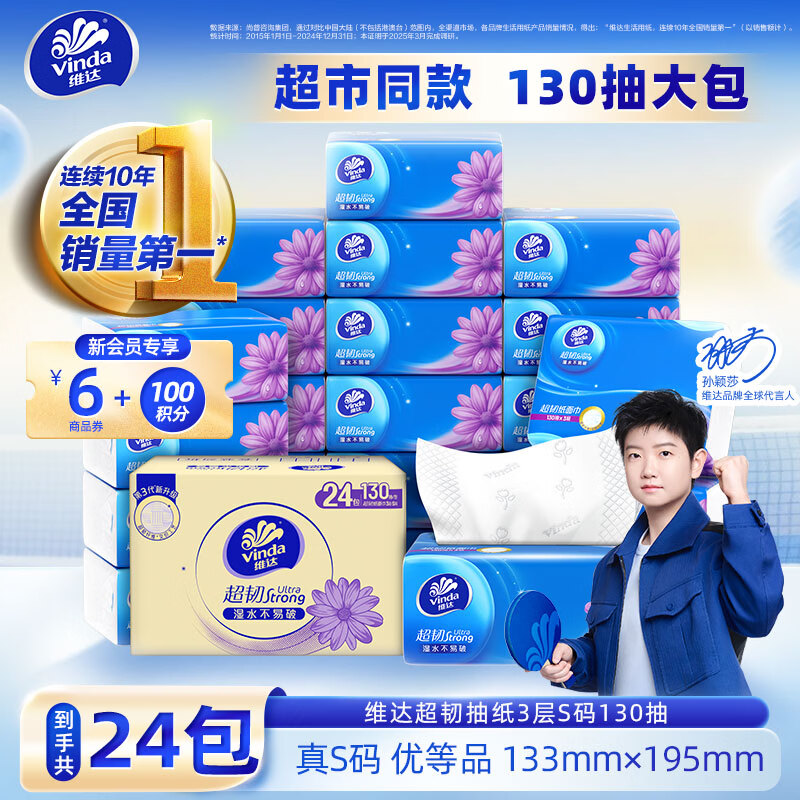 维达(Vinda)抽纸 超韧抽纸S码 湿水不易破 纸巾软抽整箱 【经典爆款】 3层 130抽*24包