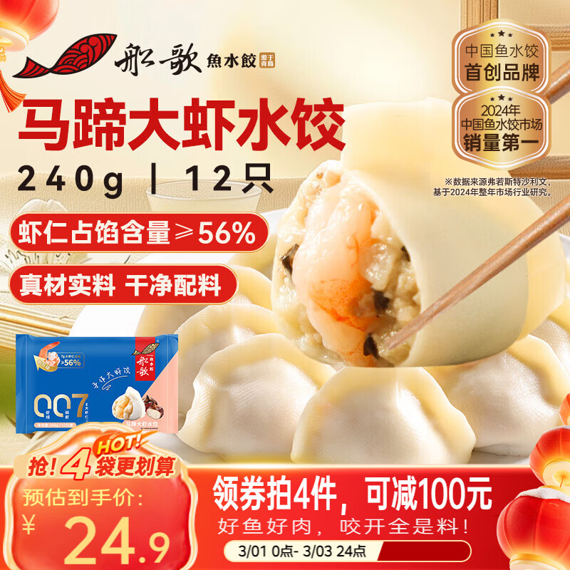 船歌鱼水饺马蹄大虾水饺240g12只早餐速食面点生鲜海鲜速冻饺子