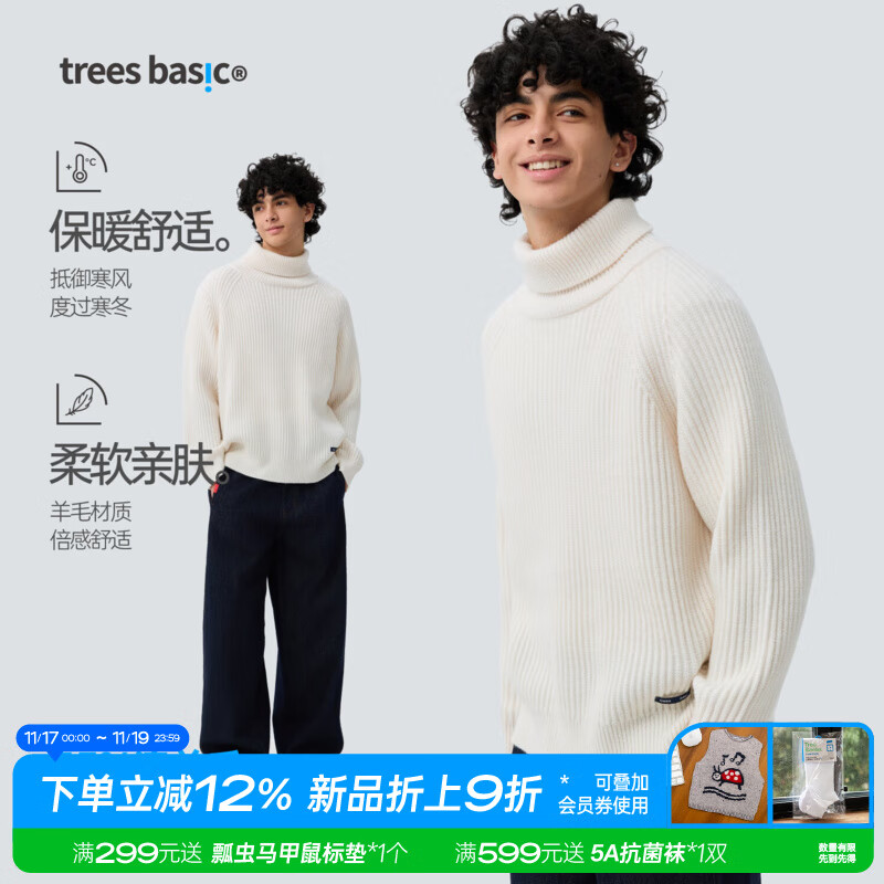 warmtreesTreesBasic基础羊毛插肩高领毛衣男女款秋冬季宽松针织套头衫 白色 M
