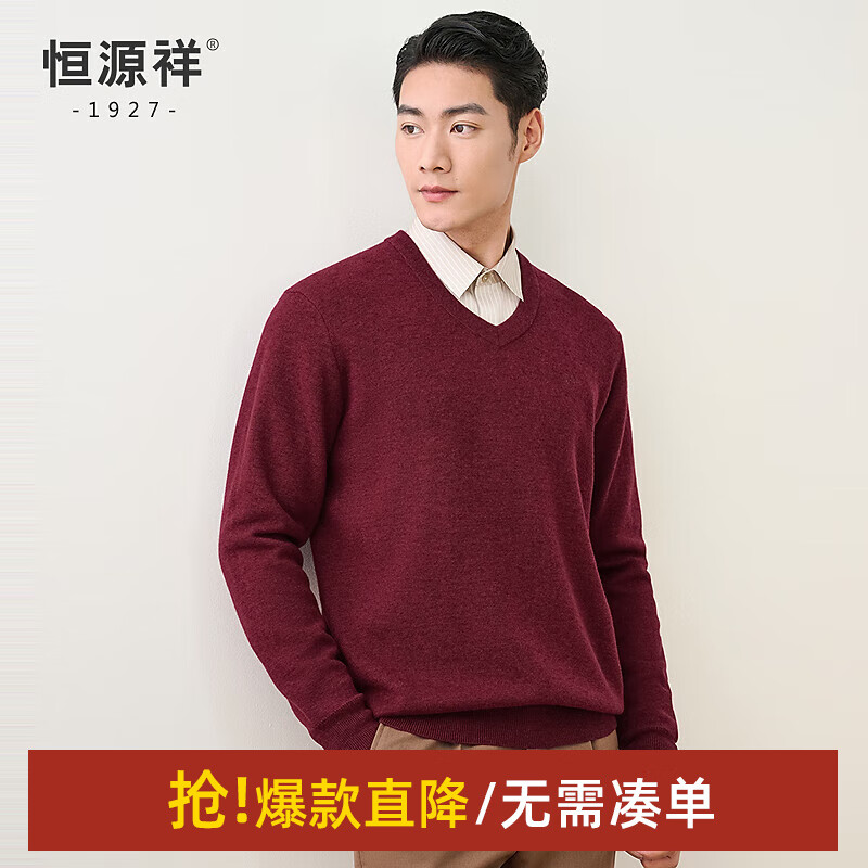 恒源祥【加厚纯羊毛】男装羊毛衫秋冬季针织衫打底爸爸装纯色内搭毛衣男 V领+深红 3XL /190/104A