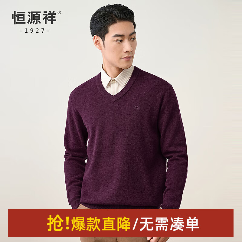 恒源祥【加厚纯羊毛】男装羊毛衫秋冬季针织衫打底爸爸装纯色内搭毛衣男 V领+紫红 M /170/88A