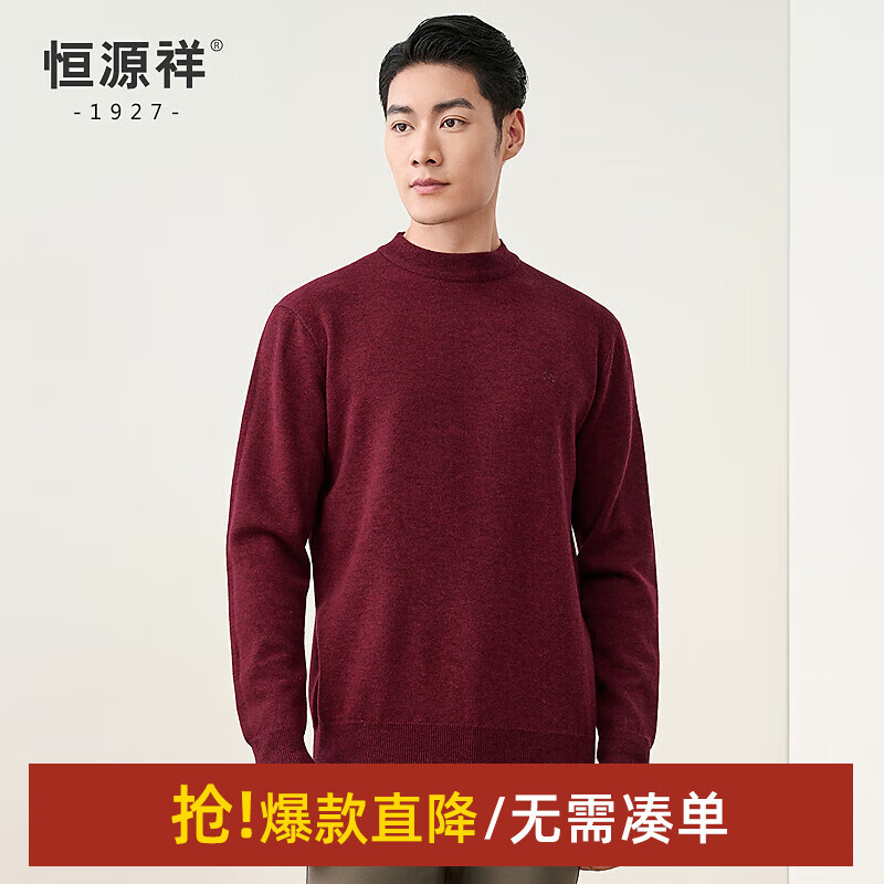 恒源祥【加厚纯羊毛】男装羊毛衫秋冬季针织衫打底爸爸装纯色内搭毛衣男 深红 3XL /190/104A