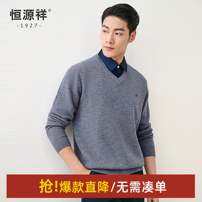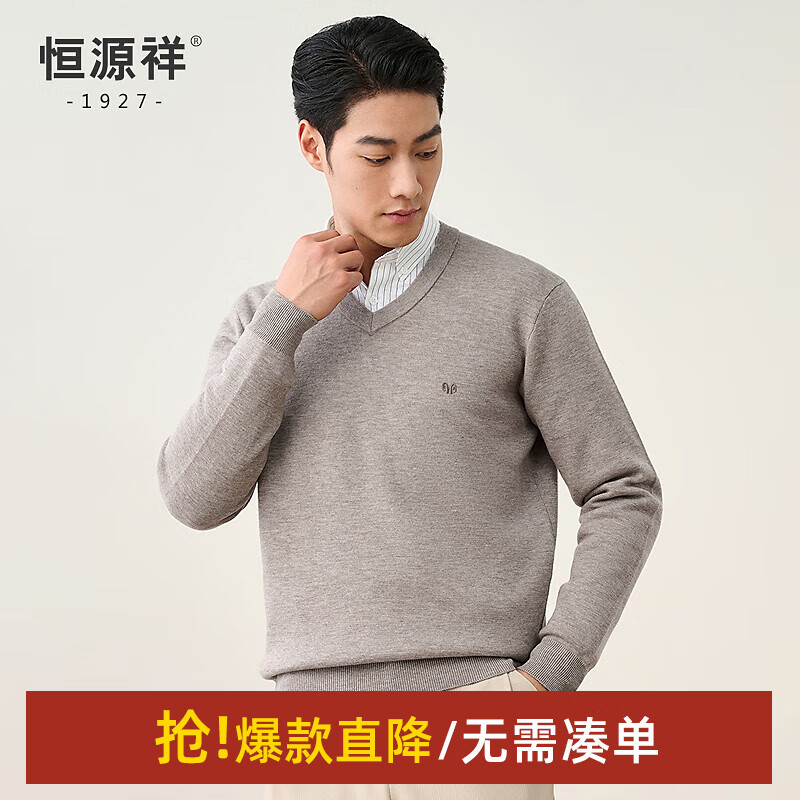 恒源祥【加厚纯羊毛】男装羊毛衫秋冬季针织衫打底爸爸装纯色内搭毛衣男 V领+中灰 3XL /190/104A