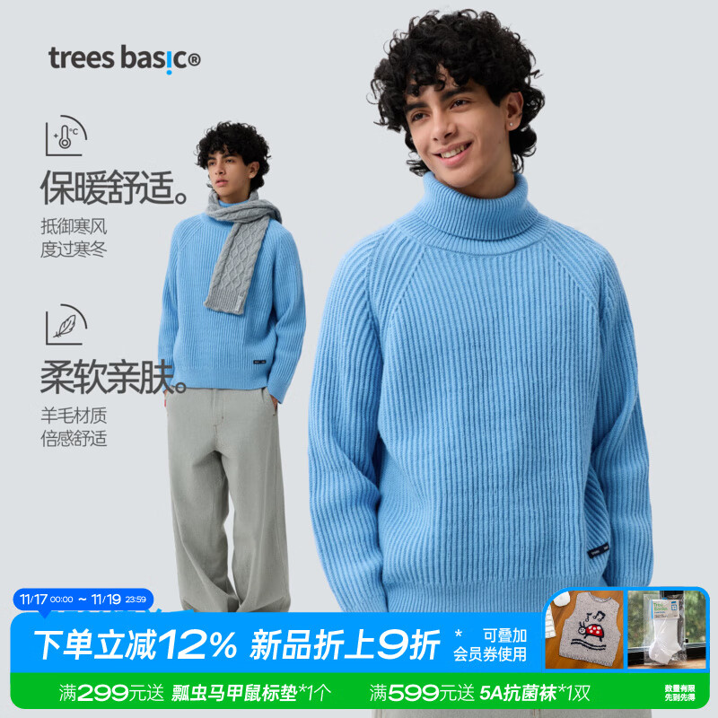warmtreesTreesBasic基础羊毛插肩高领毛衣男女款秋冬季宽松针织套头衫 靛天蓝 L