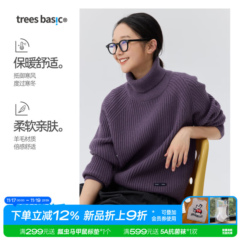 warmtreesTreesBasic基础羊毛插肩高领毛衣男女款秋冬季宽松针织套头衫 葡萄紫 M
