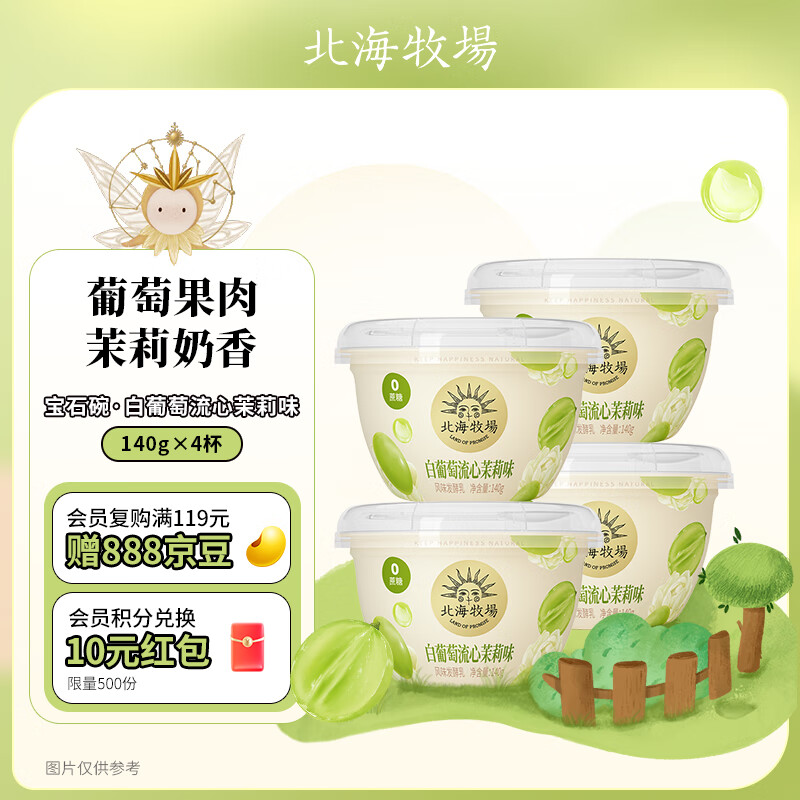 北海牧场宝石碗白葡萄流心茉莉140g*4杯0蔗糖3.8g/100g蛋白无蔗糖低温酸奶
